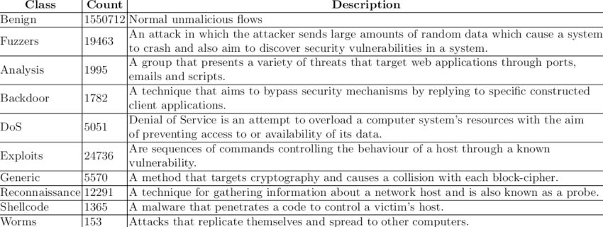 Classes : Benign, Fuzzers, Exploits, Backdoor, Reconnaissance, Generic, DoS, Shellcode, Analysis, Worms