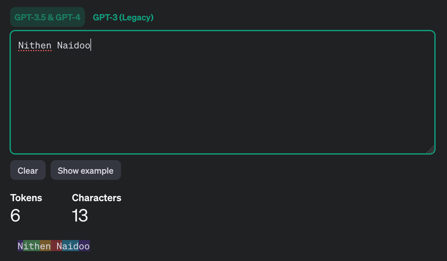 Token structure is better understood using their "tokenizer" (which can be found here). Tokens are a string sequence of characters commonly found in text. The models learn in token sequences - rather than words (like we do). For example, here is my name - passed through the tokenizer application (shown below).