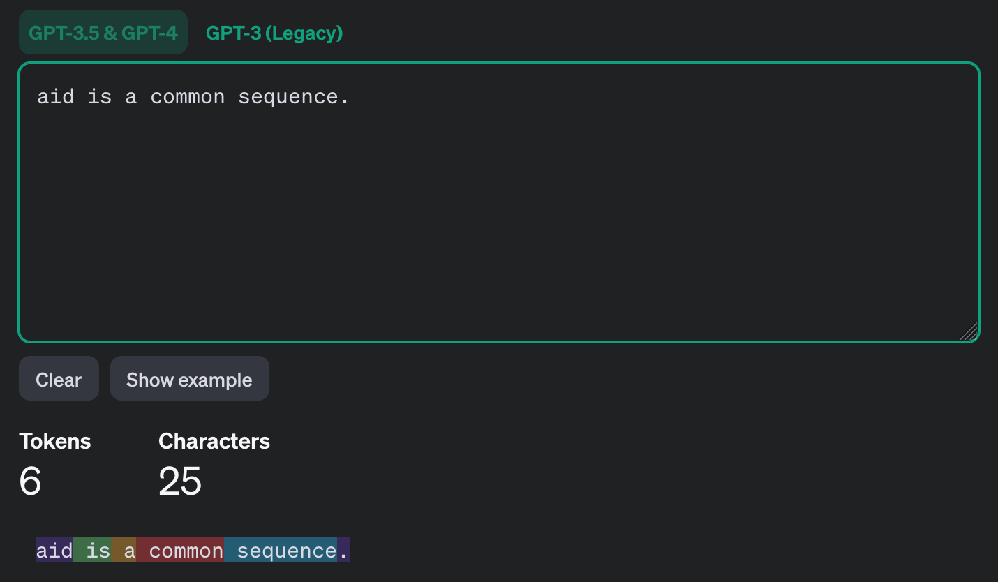 Now, my name is not a common string, but notice how the sequence "aid" appears to be a single token. This makes sense when you think about how tokens are generated.